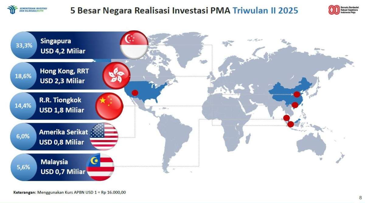 BKPM juga mencatat bahwa terdapat lima negara dengan realisasi investasi terbesar ke Indonesia pada Triwulan II-2025, yakni Singapura, Hongkong, China, Amerika Serikat dan Malaysia.