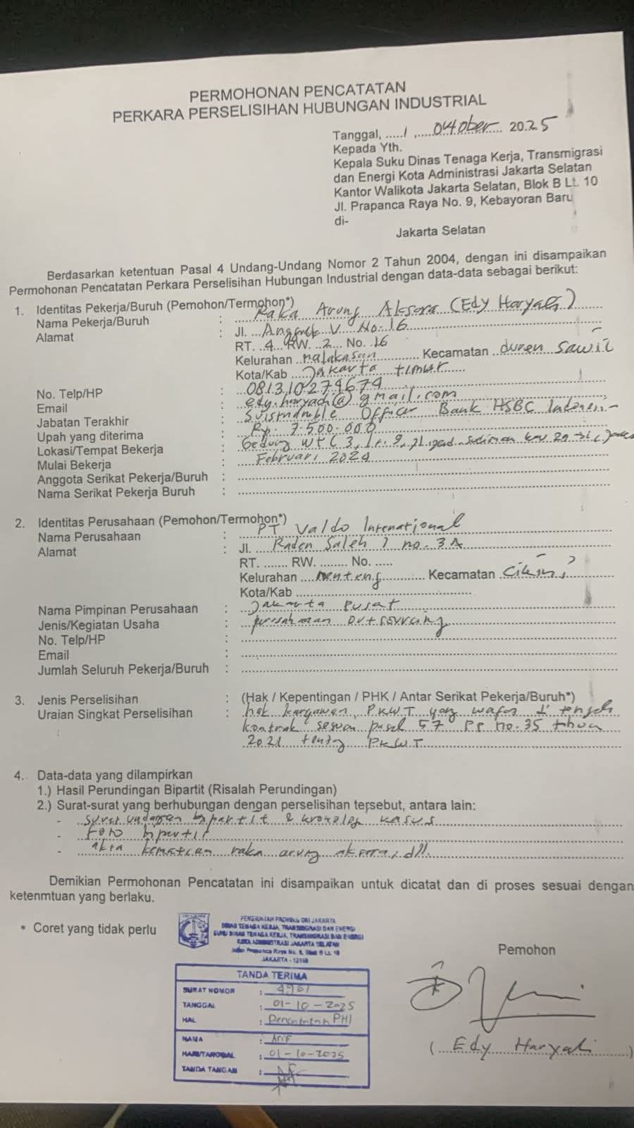“Hari ini (Rabu, 1 Oktober 2025) saya telah resmi mendaftarkan pencatatan Tripartit sebagai tindak lanjut dari perselisihan hubungan industrial antara saya selaku ahli waris anak saya dengan PT Valdo International, sebuah perusahaan outsourcing yang digunakan Bank HSBC Indonesia untuk mengontrak Arung,” ujar Edy Haryadi dalam rilis yang dibagikan diakun facebooknya dikutip Bergelora.com di Jakarta, Jumat (10/10).