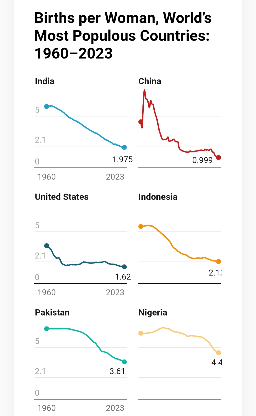 Angka kelahiran di India, negara terpadat di dunia, terus menurun selama enam dekade terakhir. Pada bulan Juni, Dana Kependudukan PBB melaporkan bahwa angka kelahiran India mencapai 1,9 anak per perempuan, turun dari lima atau enam anak pada tahun 1960.