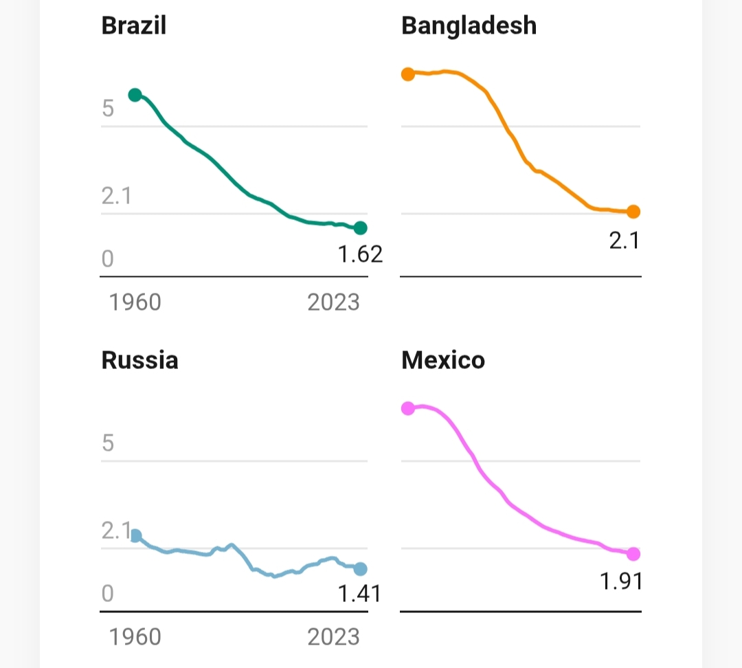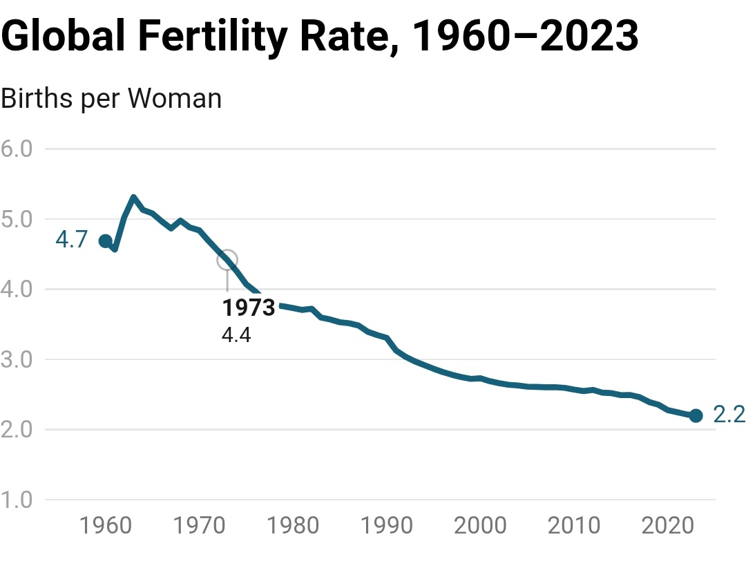 Pada tahun 1960, angka kelahiran berkisar antara empat dan lima. Pada tahun 2023, angka tersebut telah berkurang setengahnya menjadi 2,2, mendekati 2,1, tingkat di mana suatu populasi berganti dari satu generasi ke generasi berikutnya.