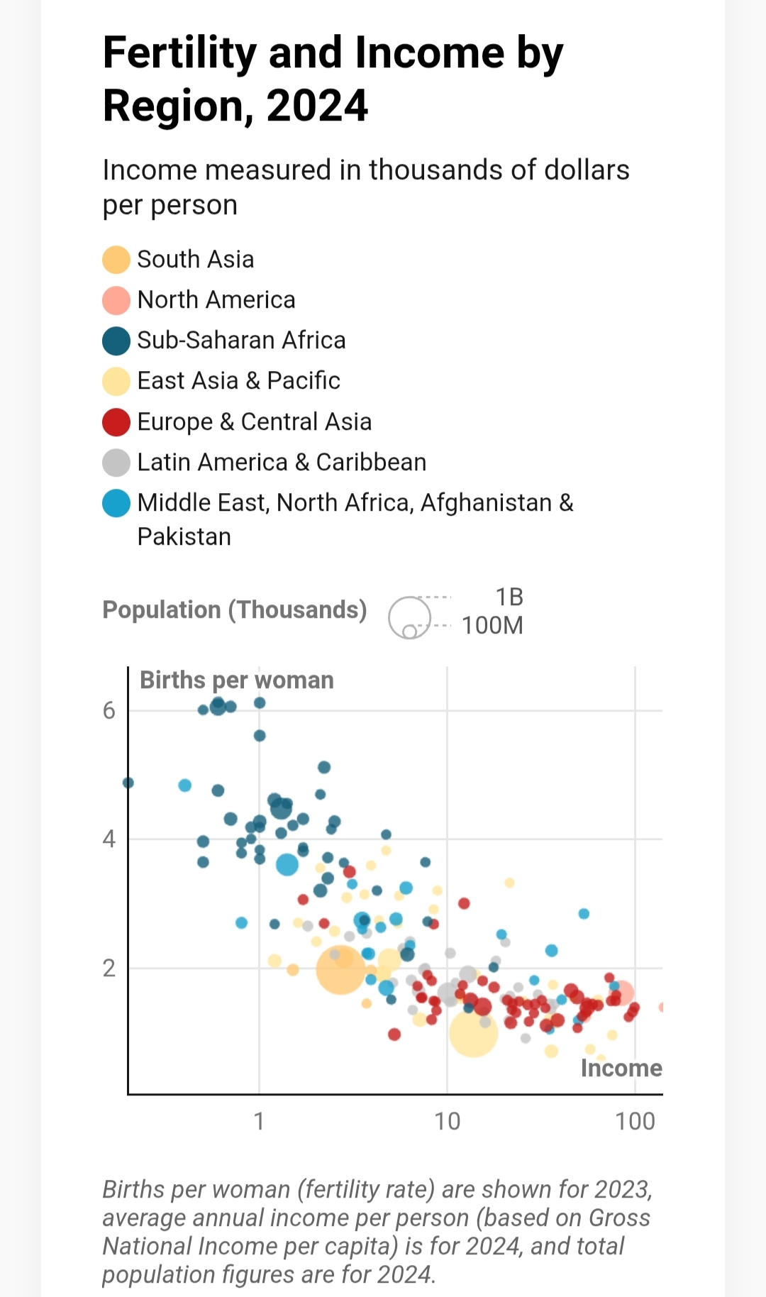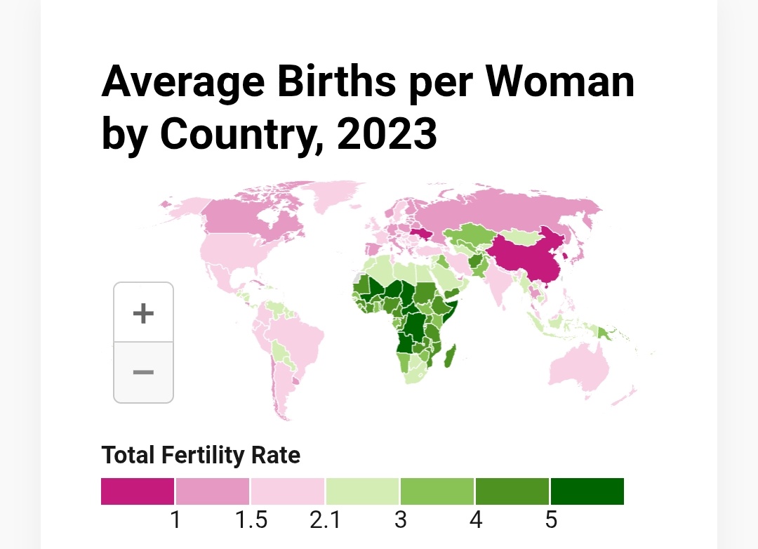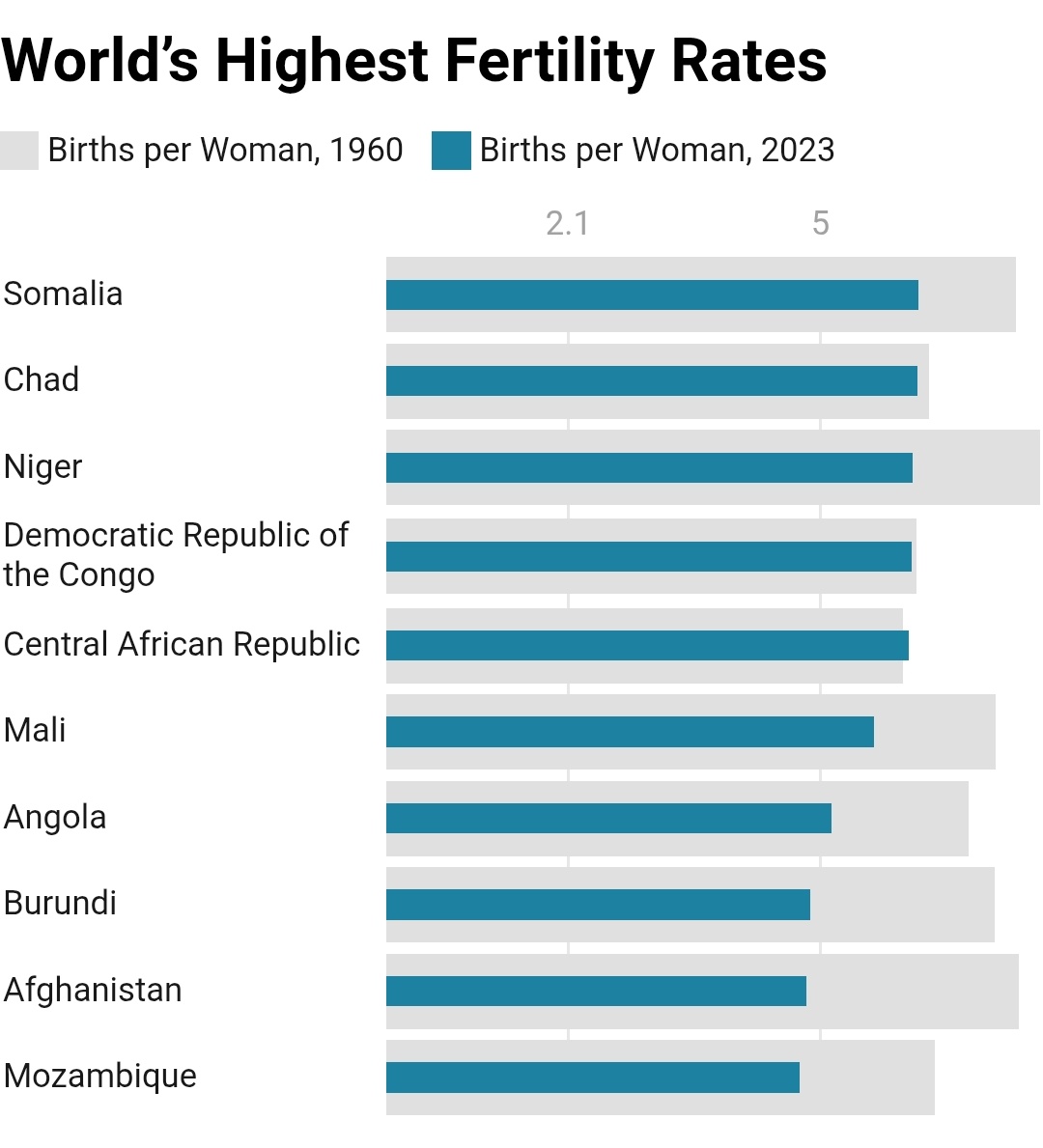 Hanya sekitar 4 persen populasi dunia yang berada di negara-negara dengan tingkat kesuburan tinggi—lebih dari lima anak per perempuan—dan semua negara tersebut berada di Afrika, menurut Biro Sensus. Bahkan di negara-negara tersebut, tingkat kesuburan umumnya lebih rendah daripada sebelumnya.