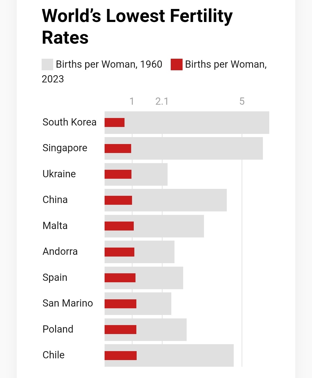 Negara-negara Asia dan Eropa memiliki tingkat kesuburan terendah di dunia, dan Korea Selatan (0,72), Singapura (0,97), Ukraina (0,977), dan Cina (0,999) semuanya memiliki tingkat di bawah satu.