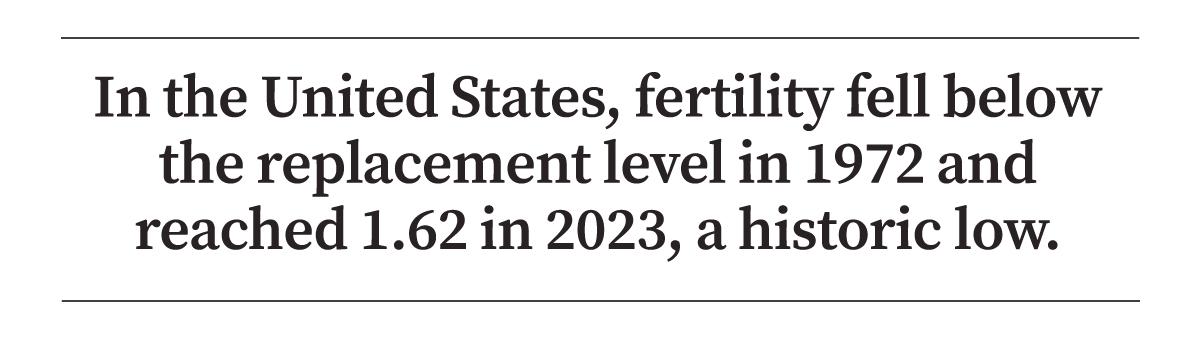 Di Amerika Serikat, tingkat kesuburan terus menurun. Angka ini berada di bawah tingkat penggantian pada tahun 1972, dan pada tahun 2023, mencapai 1,62—tingkat terendah dalam sejarah.