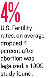 Tingkat kesuburan rata-rata turun sebesar 4 persen di Amerika Serikat setelah aborsi dilegalkan, menurut sebuah studi tahun 1999 terhadap masing-masing negara bagian yang diterbitkan dalam American Journal of Public Health.