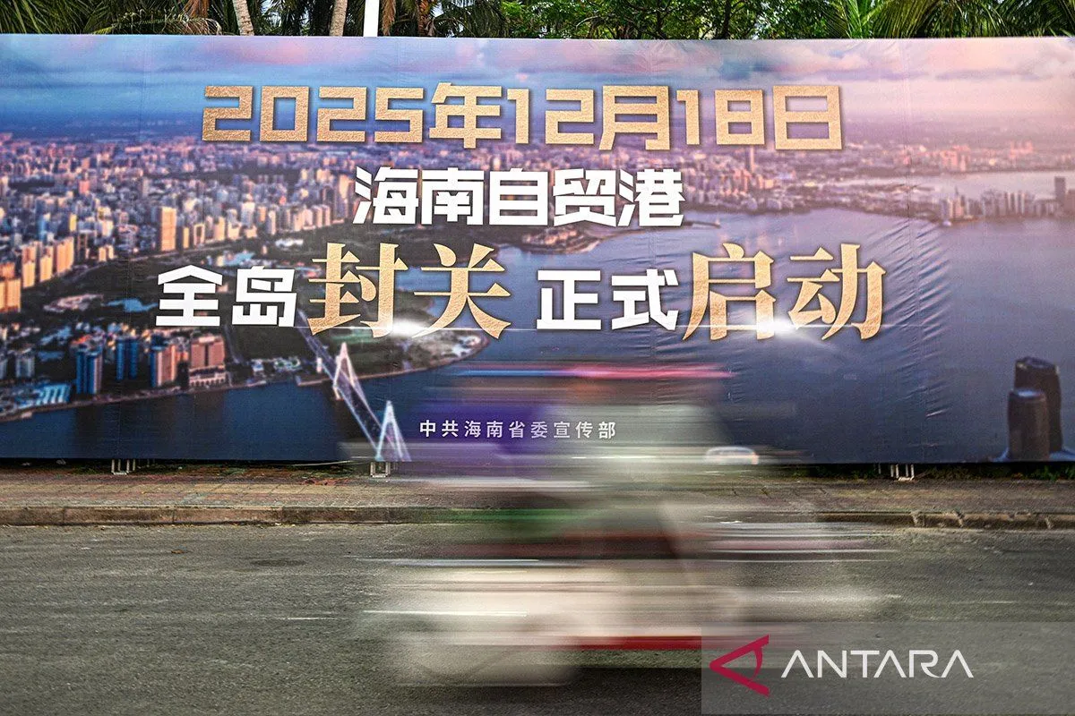 Sebuah papan reklame untuk peluncuran operasi bea cukai khusus di seluruh pulau di Pelabuhan Perdagangan Bebas (FTP) Hainan terlihat di Wenchang, Provinsi Hainan, China selatan, Rabu (17/12/2025). (Ist)