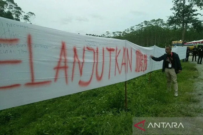 Spanduk itu dipasang perwakilan kepala desa (kades) seluruh Indonesia pada Sabtu, 17 Desember, saat mereka mengunjungi Titik Nol Nusantara, kawasan IKN, guna mendukung pemerintah dalam mendukung pembangunan ke depan.