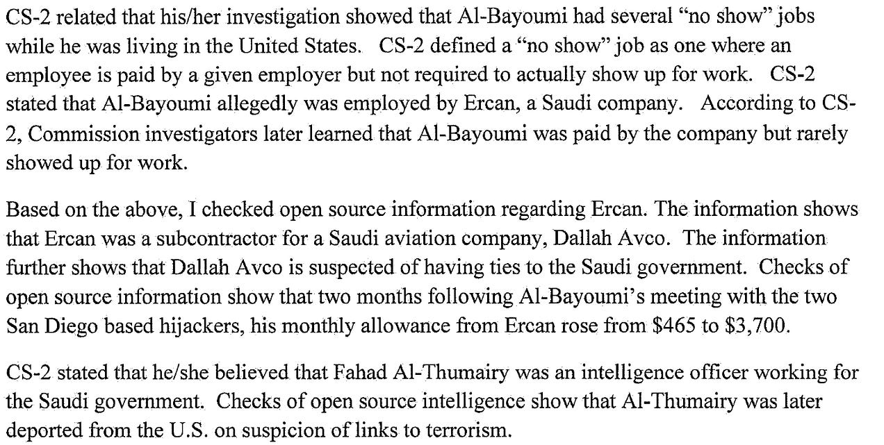 Sebelum pemecatannya, investigasi Leseman mengungkapkan bahwa Bayoumi memiliki beberapa pekerjaan “no show” selama tinggal di Amerika Serikat – “di mana seorang karyawan dibayar oleh perusahaan tertentu tetapi tidak diwajibkan untuk benar-benar hadir di tempat kerja.” Salah satu pekerjaan “no show” adalah di perusahaan Arab Saudi, Ercan, yang kantornya “jarang ia kunjungi”. Pengajuan tersebut mencatat bagaimana dua bulan setelah pertemuan Bayoumi dengan Hazmi dan Midhar, gaji bulanannya dari Ercan naik dari $465 menjadi $3.700..
