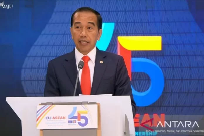 Pernyataan itu disampaikan Jokowi dalam pidatonya pada acara pembukaan KTT Peringatan 45 Tahun ASEAN-Uni Eropa di Justus Lipsius Atrium, Brussels, Rabu, 14 Desember 2022. Jokowi merupakan satu dari enam pemimpin yang diminta menyampaikan pandangan di acara pembukaan.