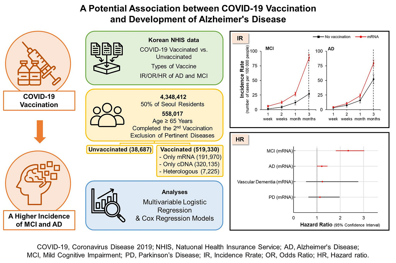 Sebuah studi kohort nasional Korea Selatan oleh Roh dkk. menganalisis lebih dari 558.000 orang dewasa berusia 65 tahun ke atas. Studi tersebut menemukan bahwa penerima suntikan mRNA COVID-19 menghadapi risiko yang jauh lebih tinggi untuk mengalami gangguan kognitif dalam tiga bulan: