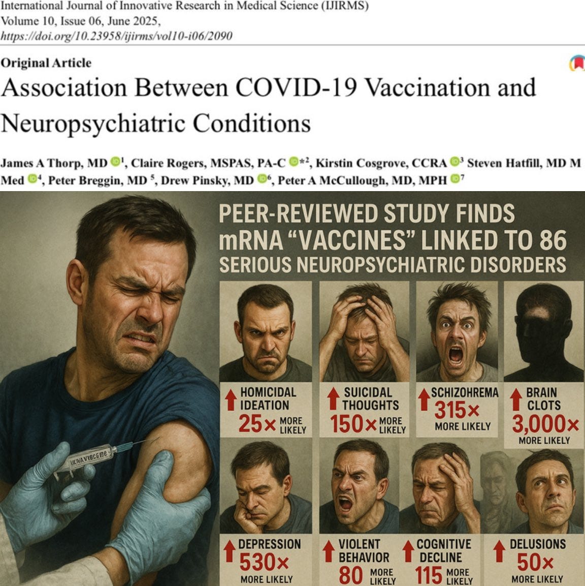 Thorp dan kawan-kawan mengidentifikasi 86 gangguan neuropsikiatri serius yang terkait dengan vaksinasi COVID-19 — termasuk gangguan kognitif, demensia, skizofrenia, pikiran bunuh diri & pembunuhan, stroke, psikosis, depresi, delusi & banyak lagi.