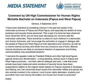 BEBERAPA waktu lalu Komisionir Tinggi HAM PBB Michelle Bachelet, dalam pernyataan resmi pada hari rabu tanggal 4 September 2019 menegaskan dirinya terganggu dengan meningkatnya kekerasan terhadap rakyat Papua dan Papua Barat dalam dua pekan terakhir.