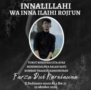 JAKARTA – Korban tewas Kanjuruhan bertambah menjadi 135 orang. Korban terbaru diketahui bernama Farzah Dwi Kurniawan yang meninggal dunia pada Minggu, 23 Oktober 2022 setelah dirawat di rumah sakit (RS).