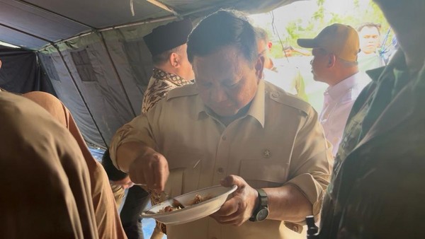 Prabowo juga mengecek dapur umum posko. Setelah berbincang dengan warga, Prabowo sempat makan bersama warga.