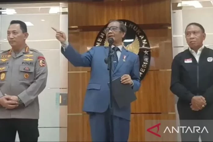 “Hari ini saya mewakili pemerintah bersama pak Menpora Zainuddin Amali dan Kapolri Jenderal Listyo Sigit Prabowo untuk menyampaikan terkait kebijakan pemerintah tentang kegiatan sepak bola sesudah peristiwa Kanjuruhan,” kata Mahfud saat jumpa pers di kantor Kemenko Polhukam, Jakarta, Senin (5/12).