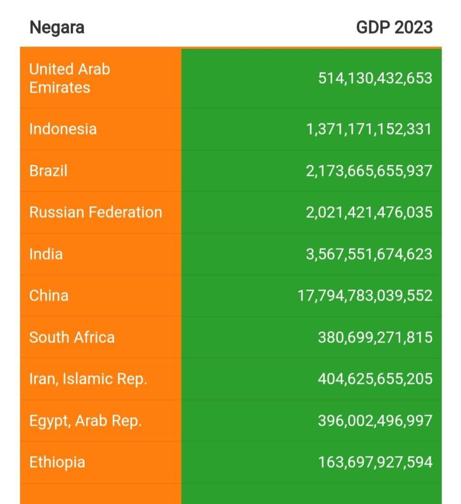 Jika dihitung, 11 anggota BRICS memiliki skala ekonomi sebesar US$ 28,8 triliun. Bila dirupiahkan maka angkanya menembus Rp 464.202,5 triliun (US$1=16.125)