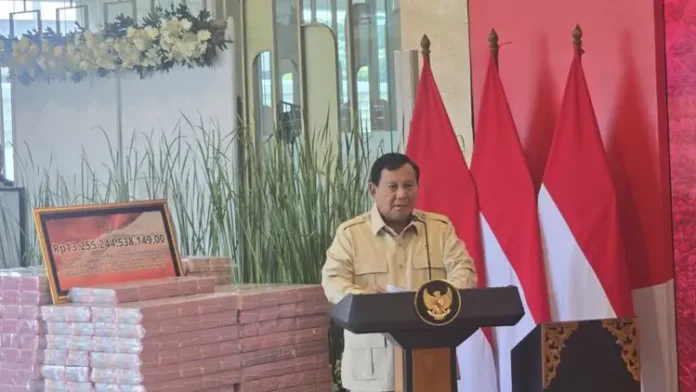JAKARTA- Prabowo menyampaikan apresiasinya kepada jajaran Kejaksaan Agung. Hal ini disampaikannya saat menyaksikan Jaksa Agung ST Burhanuddin resmi menyerahkan uang Rp13 triliun hasil sitaan terkait kasus pemberian fasilitas ekspor Crude Palm Oil atau CPO korporasi ke Kementerian Keuangan (Kemenkeu) yang diwakili oleh Menkeu Purbaya Yudhi Sadewa dikutip Bergelora.com di Kejaksaan Agung Jakarta, Senin (20/10)