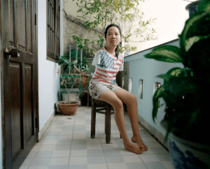 Thuy` Linh, 21 tahun. Generasi ketiga korban cacat genetik Agen Oranye, lahir tanpa lengan. Thuy` Linh menyelesaikan SMA 2 tahun lalu. Dia melamar ke banyak universitas untuk belajar tetapi kebanyakan dari mereka tidak menerimanya karena lengannya yang hilang. Ibunya akhirnya menemukan sekolah yang mau menerimanya. Dia menyelesaikan kursusnya dalam desain beberapa bulan yang lalu. Saat ini, dia sedang mencari pekerjaan yang cocok. Dia pergi ke Rumah Sakit Kebidanan Tû Dû ketika dia berusia 3 tahun dan tinggal sampai dia berusia 18 tahun. HO CHI MINH CITY, VIET NAM, 2015. (Kredit foto: Mathieu Asselin)