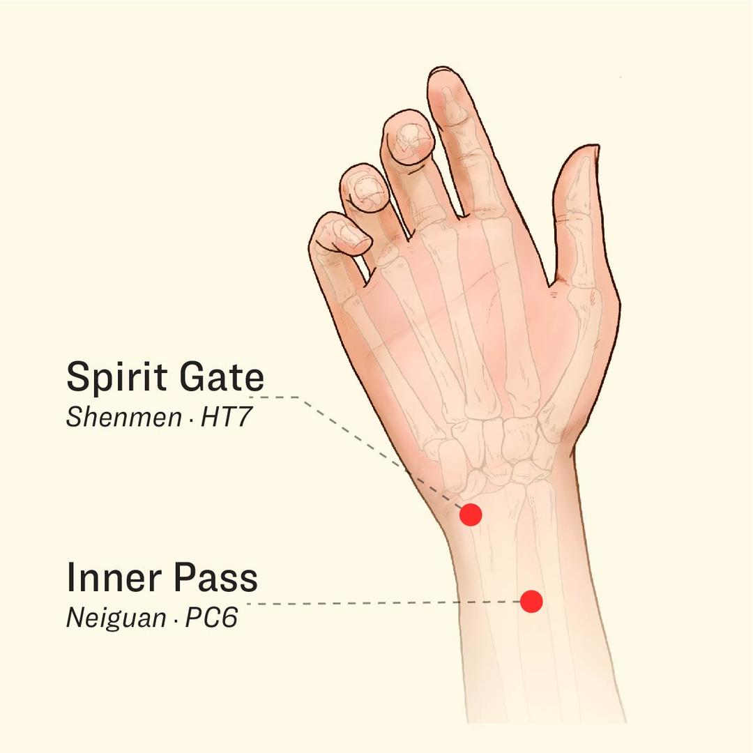 Gerbang Dalam (“Neiguan”): Terletak selebar tiga jari di atas lipatan pergelangan tangan, di antara kedua tendon. Menekan titik ini dapat meredakan rasa tidak nyaman di jantung, dada, dan perut.