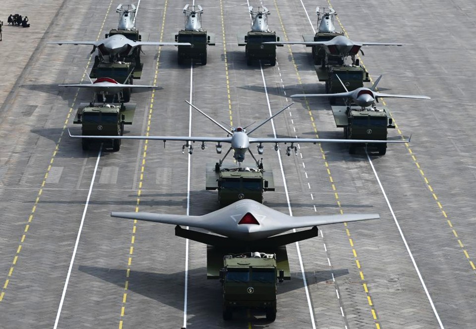 Formasi perang nirawak udara Tiongkok pada parade militer akbar di Beijing, Tiongkok, pada 3 September 2025. (Kredit Gambar: Xinhua/Zhang Cheng)